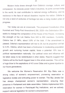 ମହିଳା ସଂରକ୍ଷଣ ବିଲ୍ ସମ୍ପର୍କରେ ଉଲ୍ଲେଖ କରି ଶ୍ରୀ ପଟ୍ଟନାୟକ କହିଛନ୍ତି ଯେ ମହାନ ଜନନାୟକ ବିଜୁ ବାବୁ ମହିଳା ସଂରକ୍ଷଣ ଓ ମହିଳା ସଶକ୍ତି କରଣ କ୍ଷେତ୍ରରେ ସାରା ଦେଶରେ ଜଣେ ଅଗ୍ରଦୂତ ଥିଲେ । ବିଜୁ ଜନତା ଦଳ ସବୁବେଳେ ବିଧାନ ସଭା ଓ ପାର୍ଲାମେଣ୍ଟରେ ମହିଳା ମାନଙ୍କ ପ୍ରତିନିଧିତ୍ୱ ବୃଦ୍ଧି ପାଇଁ ସଂଗ୍ରାମ କରି ଆସିଛି । ପଞ୍ଚାୟତି ରାଜ ଅନୁଷ୍ଠାନ ମାନଙ୍କରେ ମହିଳା ମାନଙ୍କ ପାଇଁ ୫୦ ପ୍ରତିଶତ ସଂରକ୍ଷଣ ବିଜେଡି ବହୁ ପୂର୍ବରୁ କରିଛି । ତେଣୁ ମହିଳାଙ୍କ ସଶକ୍ତି କରଣ ପାଇଁ ଆସୁଥିବା ଜାତୀୟ ବିଧେୟକକୁ ବିଜୁ ଜନତା ଦଳ ପୂର୍ଣ୍ଣ ସମର୍ଥନ ଦେବ ବୋଲି ଶ୍ରୀ ପଟ୍ଟନାୟକ ତାଙ୍କ ପତ୍ରରେ ମଧ୍ୟ ସୂଚନା ଦେଇଛନ୍ତି ।