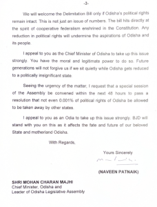 ତାଙ୍କ ପତ୍ରରେ ଶ୍ରୀ ପଟ୍ଟନାୟକ ଆହୁରି ଉଲ୍ଲେଖ କରିଛନ୍ତି ଯେ ଯଦି ଓଡିଶାର ରାଜନୈତିକ ଅଧିକାର ଅକ୍ଷୁର୍ଣ୍ଣ ରୁହେ, ତେବେ ଯାଇ ଆମେ ଏହି ବିଲ୍କୁ ସ୍ୱାଗତ କରିବୁ । କିନ୍ତୁ ଆମର ମହାନ ସମ୍ବିଧାନରେ ଉଲ୍ଲିଖିତ ସହଯୋଗ ମୂଳକ ସଂଘୀୟବାଦର ଏହି ବିଲ୍ ବିରୁଦ୍ଧାଚରଣ କରୁଅଛି । ତେଣୁ ଓଡିଶାର ରାଜନୈତିକ ଅଧିକାର କ୍ଷୁର୍ଣ୍ଣ ହେଲା ଭଳି ଯଦି କୌଣସି କାର୍ଯ୍ୟ ଘଟେ ତେବେ ଏହା ଓଡିଶାବାସୀଙ୍କର ଆଶା ଆକାଂକ୍ଷା ପ୍ରତି ଐତିହାସିକ ଧୋକା ହେବ ବୋଲି ଶ୍ରୀ ପଟ୍ଟନାୟକ କହିଛନ୍ତି ।