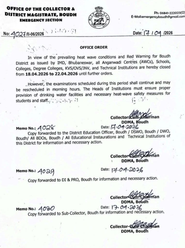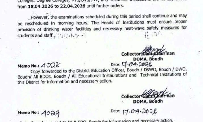 ଭୁବନେଶ୍ୱର, ୧୮/୦୪: ପ୍ରବଳ ଖରା ଓ ଗୁଳୁଗୁଳିକୁ ଦୃଷ୍ଟିରେ ରଖି ବୌଦ୍ଧରେ ଆଜିଠୁ ୨୨ ତାରିଖ ଯାଏଁ ସ୍କୁଲ୍ ଓ କଲେଜ୍ ଛୁଟି ଘୋଷଣା କରାଯାଇଛି। ପ୍ରବଳ ଖରା ଓ ଅସହ୍ୟ ଗରମକୁ ଦୃଷ୍ଟିରେ ରଖି ଜିଲ୍ଲାପାଳ ଏହି ନିଷ୍ପତ୍ତି ନେଇଛନ୍ତି। ସକାଳ ସମୟରେ ପରୀକ୍ଷା ଅନୁଷ୍ଠିତ ହୋଇପାରିବା ନେଇ ଚିଠିରେ ଉଲ୍ଲେଖ ରହିଛି।