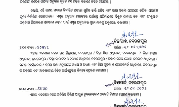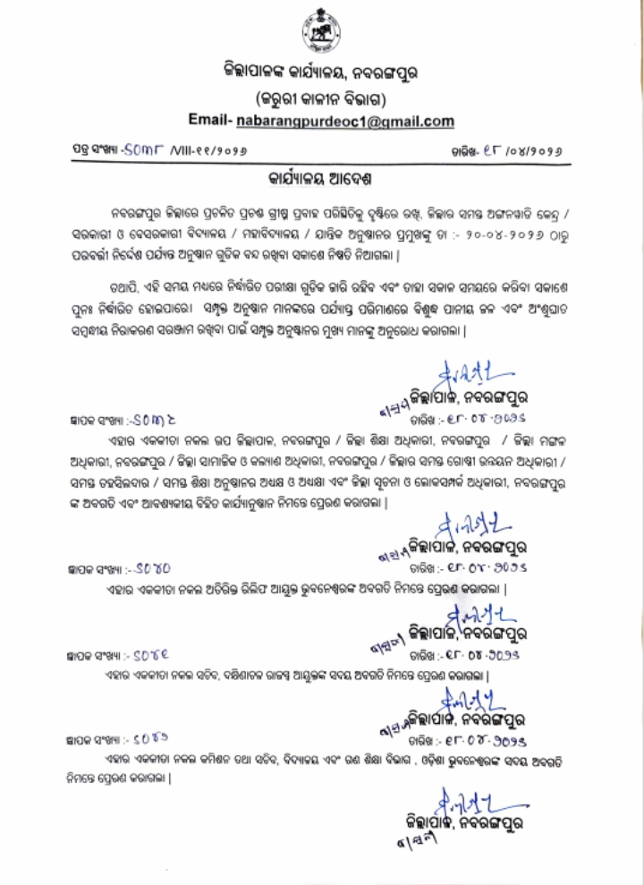 ନବରଙ୍ଗପୁର, ୧୮/୦୪: ନବରଙ୍ଗପୁର ଜିଲ୍ଲାରେ ଆସନ୍ତା ୨୦ରୁ ସମସ୍ତ ସ୍କୁଲ, କଲେଜ ଛୁଟି ଘୋଷଣା କରାଯାଇଛି। ପ୍ରଚଣ୍ଡ ଗ୍ରୀଷ୍ମ ପ୍ରବାହକୁ ଦୃଷ୍ଟିରେ ରଖି ଜିଲ୍ଲାପାଳଙ୍କ ନିଷ୍ପତ୍ତି। ଅଙ୍ଗନବାଡ଼ି କେନ୍ଦ୍ର ଓ ବୈଷୟିକ ଶିକ୍ଷାନୁଷ୍ଠାନ ମଧ୍ୟ ବନ୍ଦ ରହିବ। ପରବର୍ତ୍ତୀ ନିର୍ଦ୍ଦେଶ ପର୍ଯ୍ୟନ୍ତ ବନ୍ଦ ରଖିବାକୁ ଜିଲ୍ଲାପାଳ ଘୋଷଣା କରିଛନ୍ତି। କିନ୍ତୁ ପୂର୍ବ ନିର୍ଦ୍ଧାରିତ ପରୀକ୍ଷା ଗୁଡ଼ିକ ଜାରି ରଖିବାକୁ ନିଷ୍ପତ୍ତି।