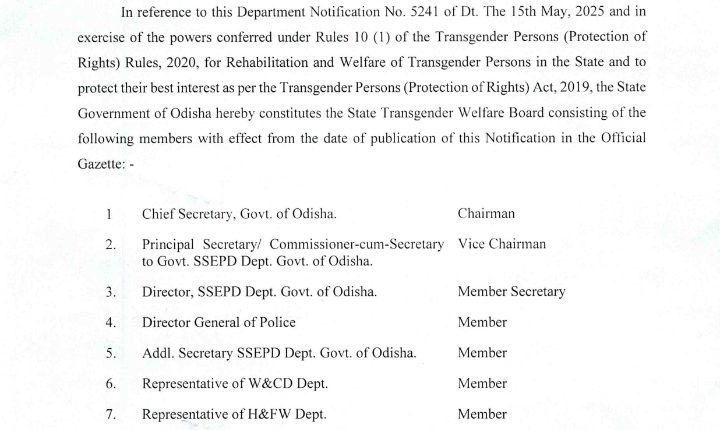 ବିଭାଗର ନିର୍ଦ୍ଦେଶକ ସଦସ୍ୟ ସଚିବ ଦାୟିତ୍ବ ତୁଲାଇବେ। ଡିଜିପି ମଧ୍ୟ ଟ୍ରାନ୍ସଜେଣ୍ଡର କଲ୍ୟାଣ ବୋର୍ଡ ସଦସ୍ୟ ରହିବେ। ଅଧ୍ୟକ୍ଷଙ୍କୁ ମିଶାଇ ମୋଟ ୧୨ ଜଣ ସଦସ୍ୟଙ୍କୁ କଲ୍ୟାଣ ବୋର୍ଡରେ ସ୍ଥାନିତ କରାଯାଇଛି।