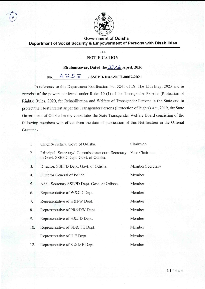 ଭୁବନେଶ୍ୱର, ୨୧/୦୪: ରାଜ୍ୟ ଟ୍ରାନ୍ସଜେଣ୍ଡର କଲ୍ୟାଣ ବୋର୍ଡ ଗଠନ କଲେ ରାଜ୍ୟ ସରକାର। ମୁଖ୍ୟ ଶାସନ ସଚିବଙ୍କୁ କମିଟିର ଅଧ୍ୟକ୍ଷ ଦାୟିତ୍ବ ମିଳିଥିବା ବେଳେ ସାମାଜିକ ସଶକ୍ତିକରଣ ଓ ଭିନ୍ନକ୍ଷମ ବିଭାଗର ସଚିବ ଉପାଧ୍ୟକ୍ଷ ରହିବେ।