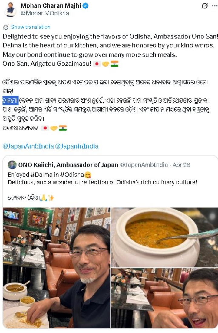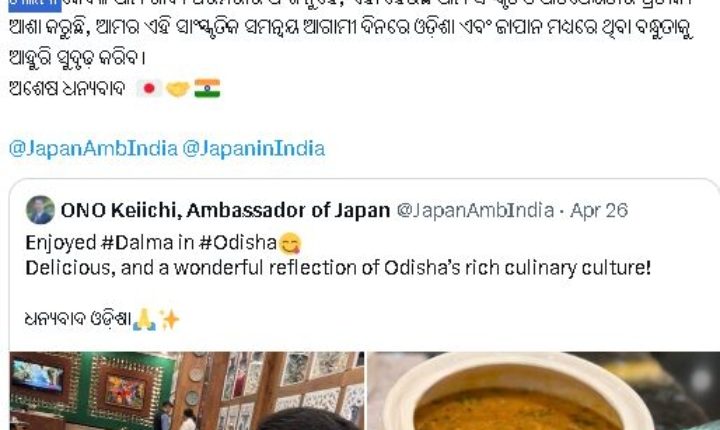 ଓଡ଼ିଶାର ‘ଡାଲମା’ ଖାଇଲେ ଜାପାନ ରାଷ୍ଟ୍ରଦୂତ, ‘X’ ହ୍ୟାଣ୍ଡଲରେ ଖୁବ୍ ପ୍ରଂଶସା କଲେ