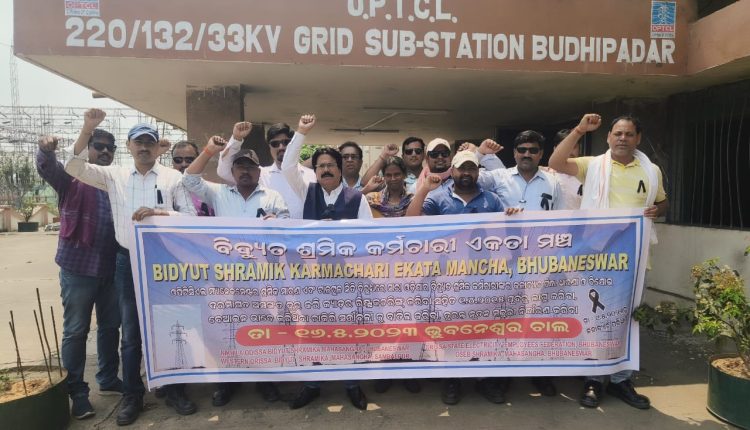 ୪ଟି ମହାସଂଘକୁ ନେଇ ଗଠିତ ହୋଇଥିବା ବିଦ୍ୟୁତ୍ କର୍ମଚାରୀ ଏକତା ମଞ୍ଚର ସଭ୍ୟମାନଙ୍କଦ୍ୱାରା ବିକ୍ଷୋଭ ପ୍ରଦର୍ଶନ